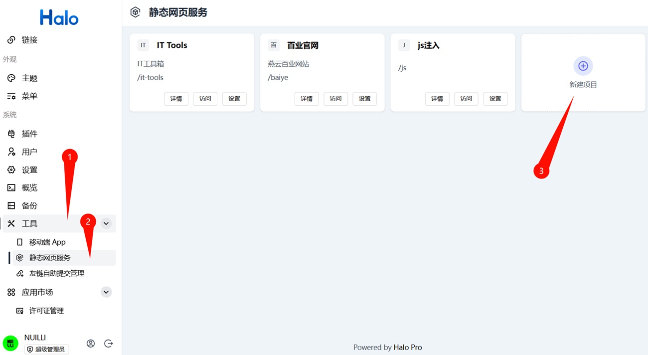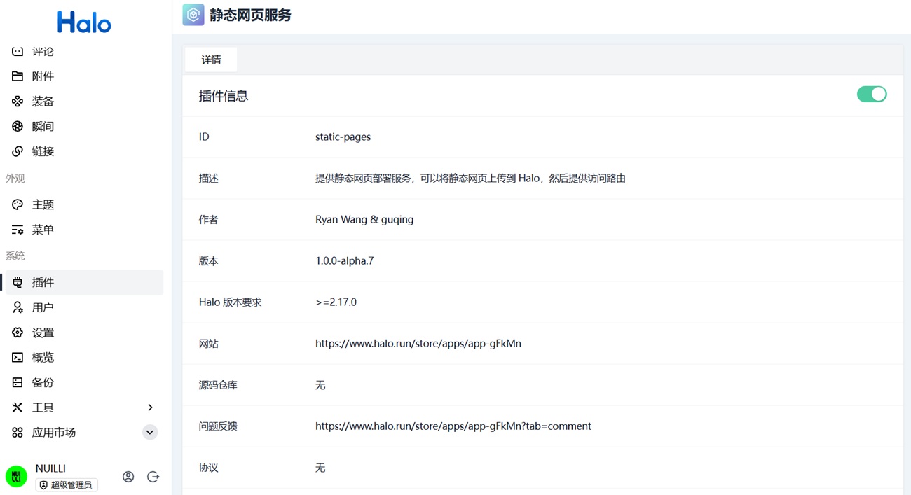 首先需要在Halo中安装 static-pages 这个插件,也叫静态网页服务插件,顾名思义就是提供静态网页部署服务,可以将静态网页上传到 Halo,然后提供访问路由