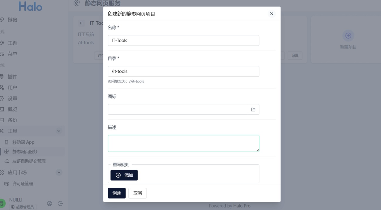IT-Tools有提供Docker的部署方式,但由于我NAS内存比较小,想着节省一下内存,以及节省端口号,让其更便于使用,就想着把它内置到Halo中,因为IT-Tools是使用Vite构建的,因此它是可以编译成静态网页集中到Halo里。